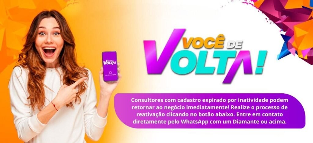Consultores com cadastro expirado por inatividade podem retornar ao negócio imediatamente! Realize o reingresso clicando no botão abaixo. Entre em contato diretamente pelo WhatsApp com um Diamante ou acima.
